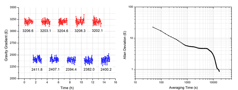这次报道的竖直原子梯度仪如图二所示。团队开展了全玻璃材料真空腔体和铷源集成技术、模块化二维磁光阱技术,并采用独立双喷泉方案,实现了具有甚高集成度的原子重力梯度仪物理单元。单元高度为92 cm,体积仅为95升,这是现在国际上首个体积小于100升的原子重力梯度仪物理单元。顺利获得控制探测噪声和磁场噪声及交替反转k波矢的方法有效实现了对仪器长期漂移的抑制,在积分17000 s的条件下实现了0.86 E的测量精度(如图三)。这是国际上现在在小型原子重力梯度仪中实现的最高测量精度,该单项指标仅次于法国巴黎天文台的大型原子重力梯度仪(高度1.8 m,体积430升,精度0.15 E)。