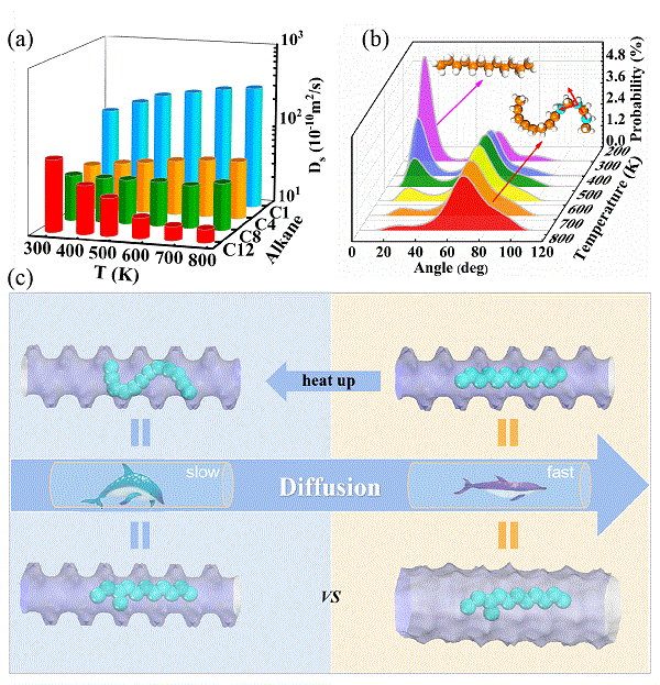 “热阻”通常指的是物体对热量传导的阻碍效果。该工作将“热阻”概念引入到传质过程中,发现“热阻效应”引起分子筛反常的扩散需要满足以下两个条件。第一时间吸附分子需要有一定的长度和柔性,其分子链长和弯曲程度随温度呈现明显变化。 其次,该类反常扩散现象需要特定的限域环境。只有当孔径与高温下长链分子形变后的维度接近时,“热阻效应”导致的反常扩散现象才会呈现。而在气相或者在孔径较大的多孔材料中通常呈现正常的扩散现象(温度越高扩散越快),不易发生此类反常现象(图1c)。该工作丰富了反常扩散的种类,揭示了高温下长链烷烃扩散受阻的微观机理,对于分子筛催化反应条件选择和优化也具有重要指导意义。