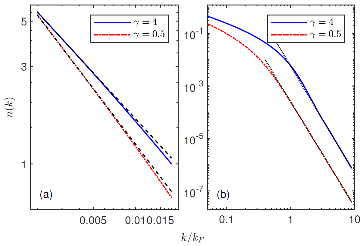(b) 大动量区,n(k) ∝ k-4。黑色虚线展示拟合斜率为-4.073 (γ=4.0)和-4.001 (γ=0.5),完美符合接触相互作用系统的普适规律——Tan’s Contact。